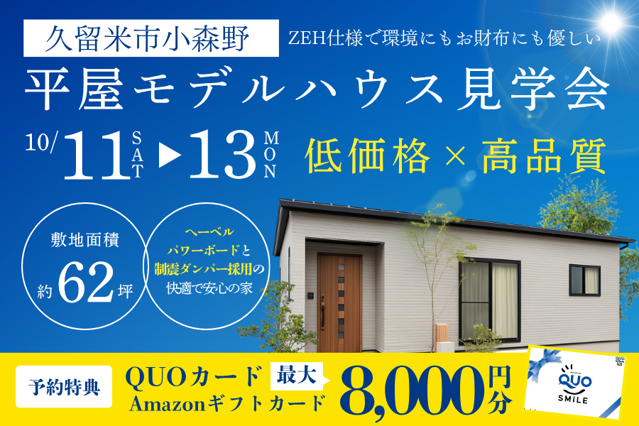 最新の高品質を体感!in小森野10月11日(土)・12日(日)・13日(月)NEW平屋が久留米市小森野にてグランドオープン!