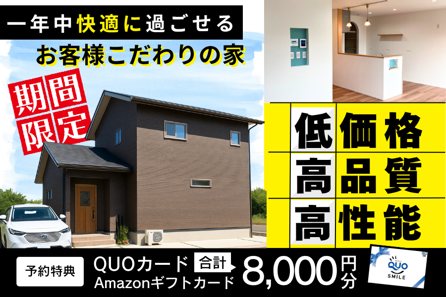 最近では、ひとり親世帯、ご夫婦2人など少人数のご家庭が多くなってきています。「最小限にコストを抑えてマイホームを建てたい」「家のこと以外にもお金をかけたい」「一生賃貸暮らしは不安」 ご家族にちょうどいいサイズの安心して暮らせるおうちを建てたい方にオススメです!
