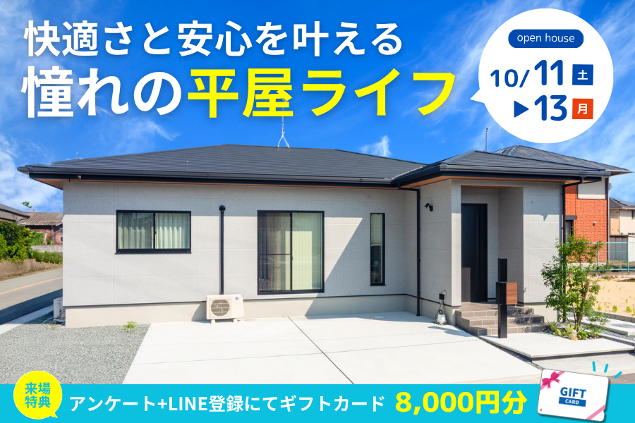 筑後市にて最新平屋を体感!10月・11月~ 最新設備搭載!NEW平屋 ~ 筑後市熊野 見学イベント開催 閑静で生活しやすい住宅街に、平屋の魅力を詰め込んだ理想の住まいが誕生しました! 奥様に大人気の平屋を見学したい方はぜひ